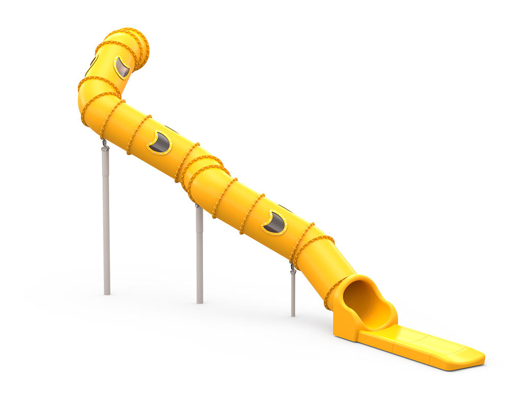 S-shaped tube slides are the most suitable for embankments. With speed-reducing curves, the slide can easily go from the top of a hill or a high play tower without excessive speed.