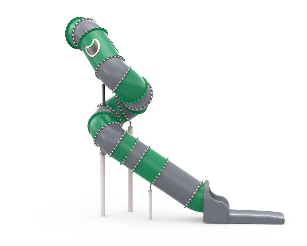 This model, which has a central spiral and a high start height of over 4 metres, is suitable for different environments because of both its shape and colour. The neutral green and grey colours mean the slide can easily be integrated in different surroundings, while it will always attract attention thanks to its impressive height.