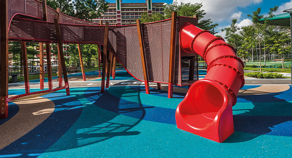 In addition to adding even more play value to the playground, our tube slides also help to create a wow-effect. The two red tube slides are eye-catching and create a good contrast to the blue poured-in-place rubber surfacing and the dark play structure. They help to capture the children's attention from the first sight and draw them to the playground.