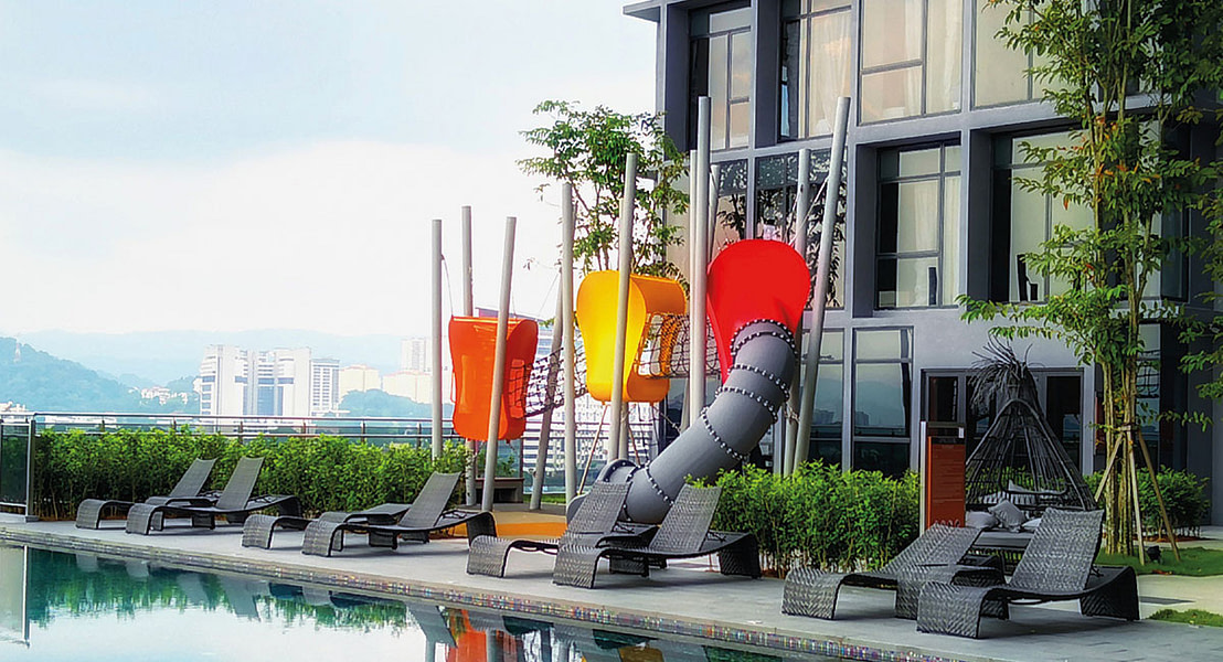 On top of one of Kuala Lumpur’s luxurious hotels, you can find a modern playground with a tube slide from LEDON. The playground allows room and possibility to play, even from several hundred meters above the ground. Contrary to slides made of steel, LEDON’s tube slides can handle very high temperatures, which is why they are often used in countries where the temperature during summetime can get extremely high.