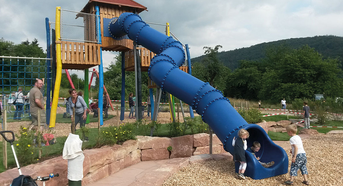 A play system in the town of Neckargemünd in south-west Germany features one of our largest tube slides. We specially designed the slide to fit in perfectly with the existing play system. The tube slide has one window which allows children to see what they are doing as they prepare to launch themselves down the tube. The blue colour was specified by the customer, so that the tube slide fits in perfectly with the surrounding playground.