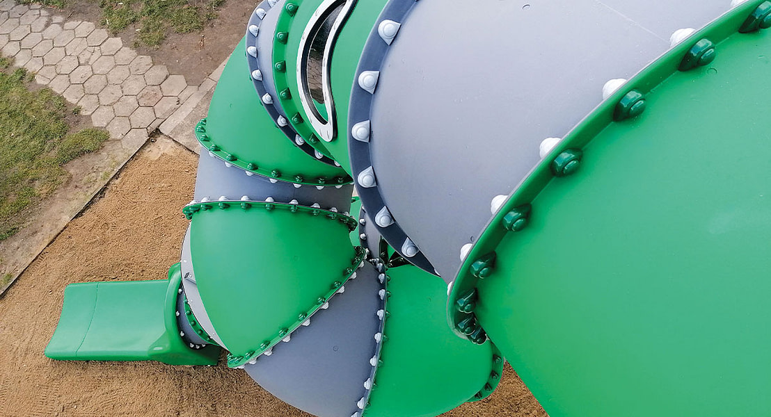 Due to the tube slides start height, an exit extension was added to provide children with a softer landing. This additional element, improves both the level of safety as well as the overall play experience.