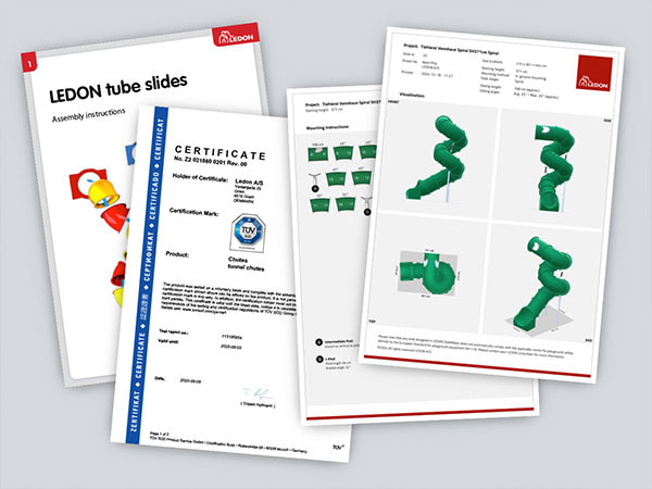 Once you have decided on the design of your tube slide, we prepare assembly instructions specifically for your tube slide. This gives you a proper and easy assembly that ensures that the tube slide is installed correctly and can withstand many years of use. If you want documentation that the tube slide design complies with EN 1176, we can apply for a drawing approval from TÜV SÜD. Contact us to inquire about any additional price.